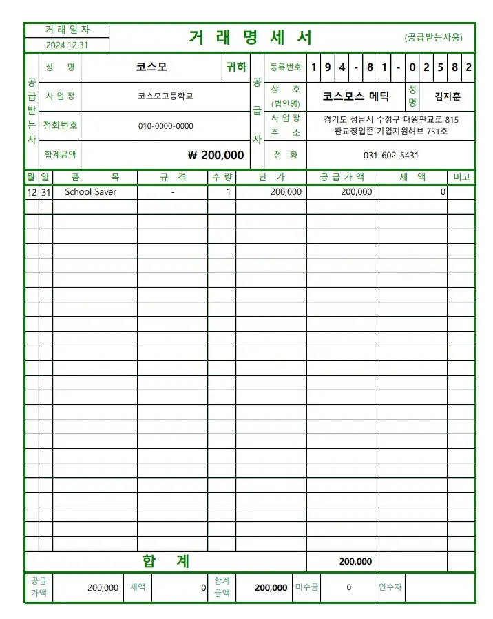 공급자 정보, 구매자 정보, 구매 내역 포함