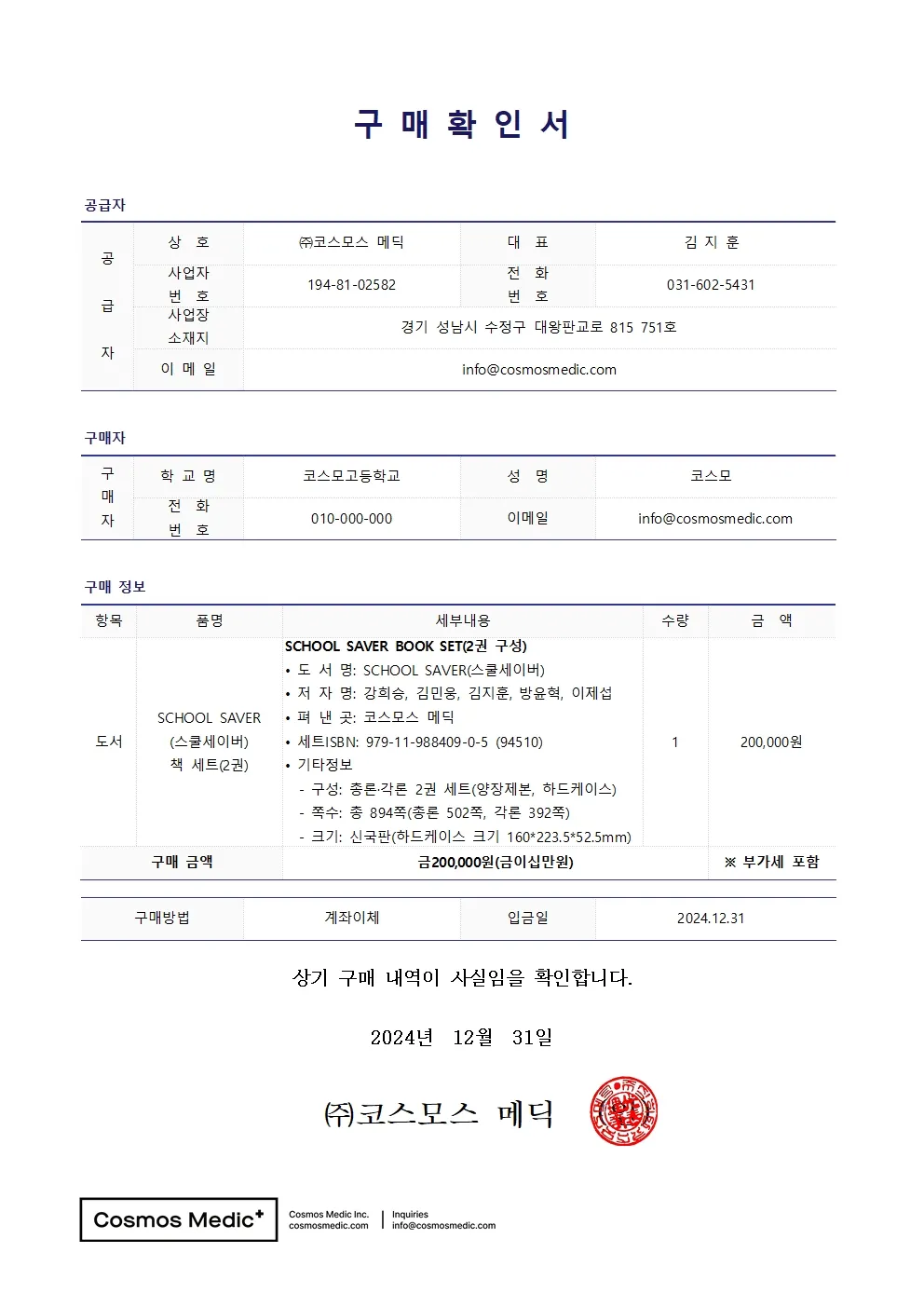 코스모스 메딕의 네이버 카페에 가입한 인증된 의료인인 보건선생님께만 판매하기 위해 네이버 카페 가입내역 확인 후 책 납품이 진행됩니다. 이러한 이유로 개인구매는 타 판매 플랫폼을 이용하지 않고 계좌이체 방법으로 진행됩니다. 선생님들의 너른 양해 부탁드립니다.